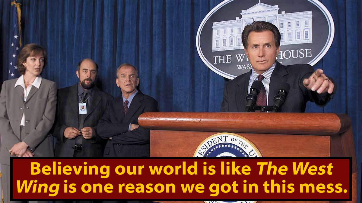 The West Wing isn't just liberal fantasy porn. It's liberal fantasy porn from 20 years ago. It portrays a universe in which one good speech filled with soaring rhetoric and an impassioned argument could convince Republicans to "do the right thing." Even back then, it was the type of thing you could only take seriously if got yourself blitzed on a jenkem-like mixture of idealism, naivety, and sniffing your own farts. But fast-forward to 2020, and The West Wing feels so divorced from the realities of current politics that it might as well be a cooking show on the planet Glarglack. Look at this clip, and maybe you'll see what I mean: