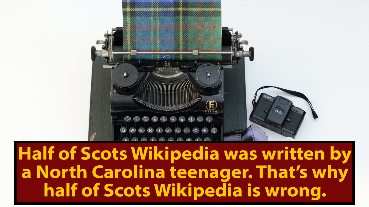 It recently came to light that fully half of the Scots version of Wikipedia was written by a 19-year-old North Carolina dude who had been editing the site since he was 12 years old. Was he a particularly precocious middle-schooler whose family is maybe a little too into their Scottish heritage? Nope. He couldn't speak Scots at all. He was just writing in a vaguely Scottish accent, presumably based on the universally enjoyable canon of Scottish Twitter.