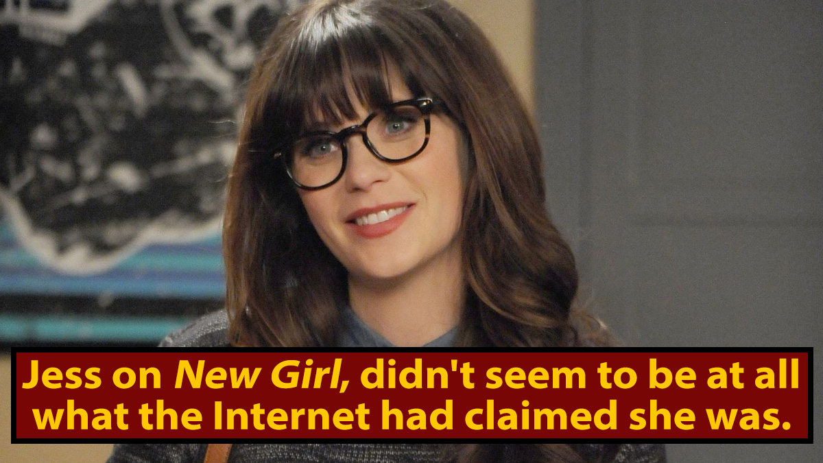 Jess Day, played by Zooey Deschanel in New Girl, didn't seem to be at all what the Internet had claimed she was, i.e., an insufferable but beautiful airhead who pratfalls her way through life. If you actually watch the show, it's shocking how badly everyone, even us, got it wrong. She's not a collection of superficial traits Hollywood decided constitutes "awkward" stuffed into a supermodel wearing glasses. Jess is a devoted schoolteacher who -- gasp -- likes to have fun. She's not great at interacting with people who aren't children, but she does so with impressive confidence. She wears grotesque prop teeth with fancy dresses for a laugh, but she knows to put them away when the fancy event commences. She gives her boyfriend an anatomical heart plush for Christmas because that's a genuinely sweet and darkly comic gesture. She sings a lot. What a monster! Sure, Jess makes unconventional but very deliberate outfit choices for dates, but far from being incompetent, there are entire episodes about how everyone in her life is rendered catatonically helpless in her absence.