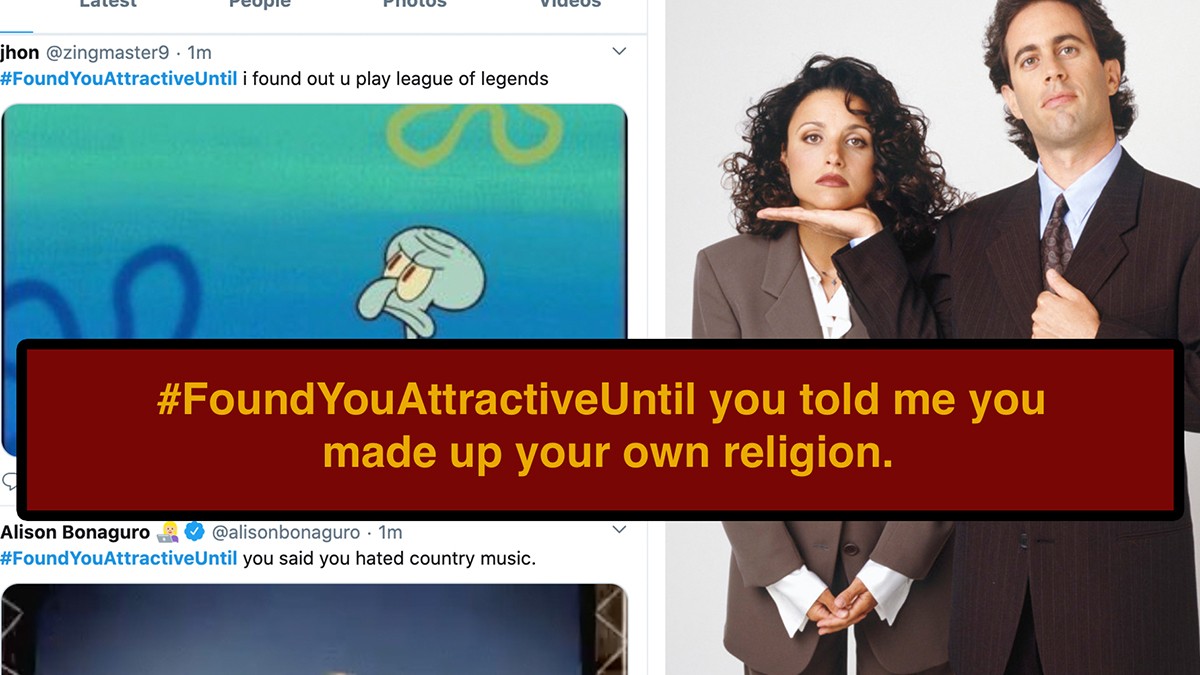 On today's episode of "Twitter is literally just a window into that haunted house with a gas leak we call the human psyche," we learned we're pretty much all just as nitpicky as Jerry Seinfeld when it comes to dating -- at least according to the trending tag #FoundYouAttractiveUntil, in which social media users share some of the pettier reasons they bailed on a fling.