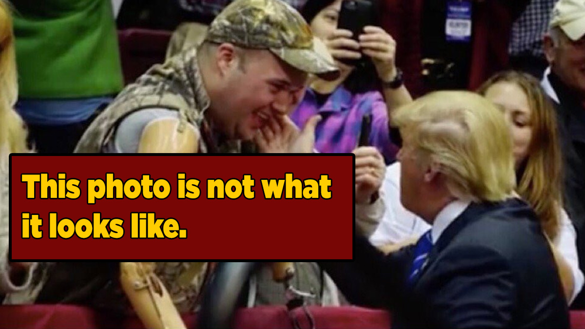 When you're pulling for a politician, you want to represent them as a man-of-the-people who loves the public he serves, especially if he has a reputation for the exact opposite. You can see then why Trump fans leaped on the following photo, supposedly of the president touching a vet who lost both arms in combat: