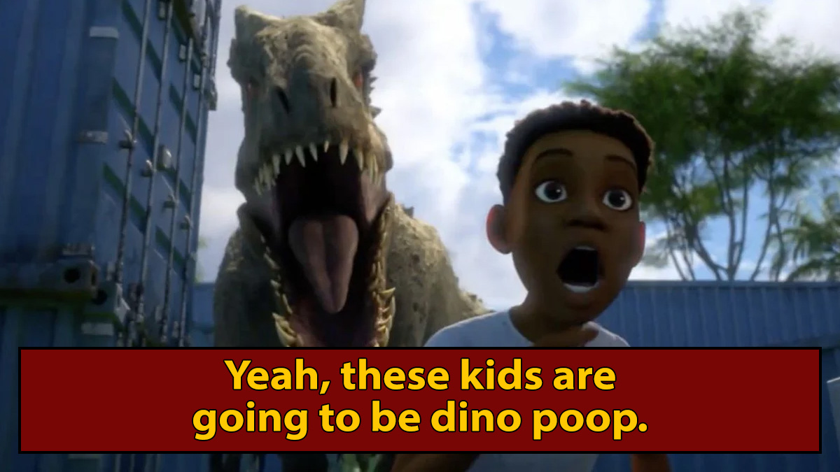 This is all considered "canon" by the way -- so next time you watch Jurassic World don't forget that the seemingly happy ending also involves the abandonment of several minors who, let's face it, would probably be eaten almost immediately. This isn't just for, like, an afternoon, according to the creators, the "conceit of the show" is that six kids are left for dead in Jurassic World "when the U.N. quarantine is put into place." This, of course, tees up a potential second season in which we see how the kids survive, hopefully making their new home the abandoned ruins of Jimmy Buffet's Margaritaville. And if Netflix declines to renew the show, they could always just retroactively CGI six tiny skeletons into Jurassic World: Fallen Kingdom.