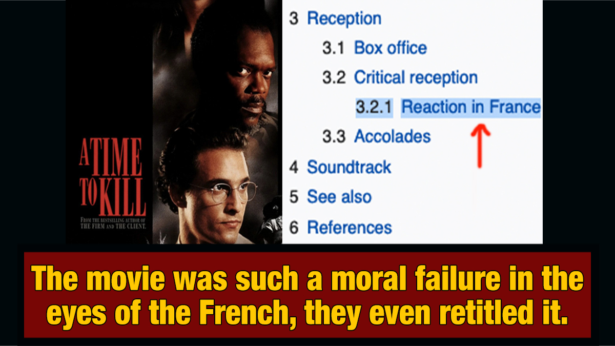 The movie did great, making thrice its budget and holding a 67% on Rotten Tomatoes, with Roger Ebert even calling it "the best of the film versions of Grisham novels" -- which becomes less of a compliment when you realize there weren't 600 of them yet. But so far, so boilerplate "this is fine" 90s popcorn movie. Where this Grisham adaptation radically differs was received in Europe, specifically France, to such extent that its Wikipedia page includes a "Reaction in France" subsection. And the reviews ... aren't good.