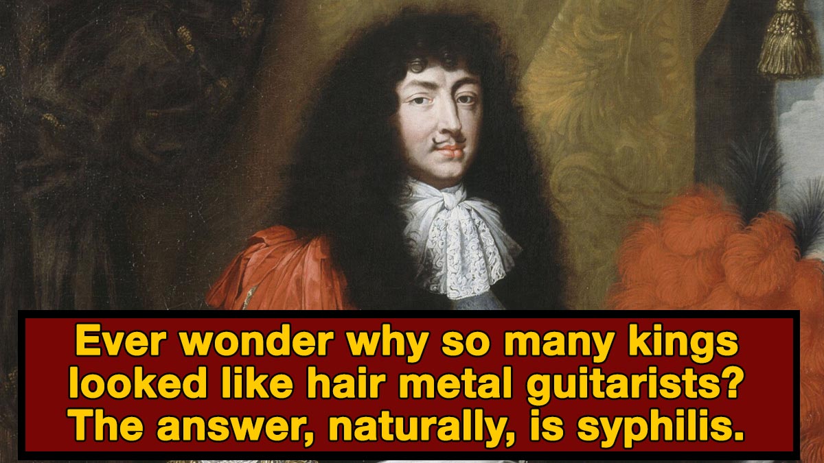 But in 1655, then King of France, Louis XIV, was showing signs of baldness, likely from syphilis, at the young age of 17. Faced with its horrors, he rounded up 48 wigmakers to save his image from the pits of alopecia. Lucky for him, the wigmakers didn't try concocting a realistic wig that only smart people could see past. Instead, they made him a stylish, glammed-out peruke. And when King Charles II of England's (Louis' cousin) hair turned gray, he did the same.