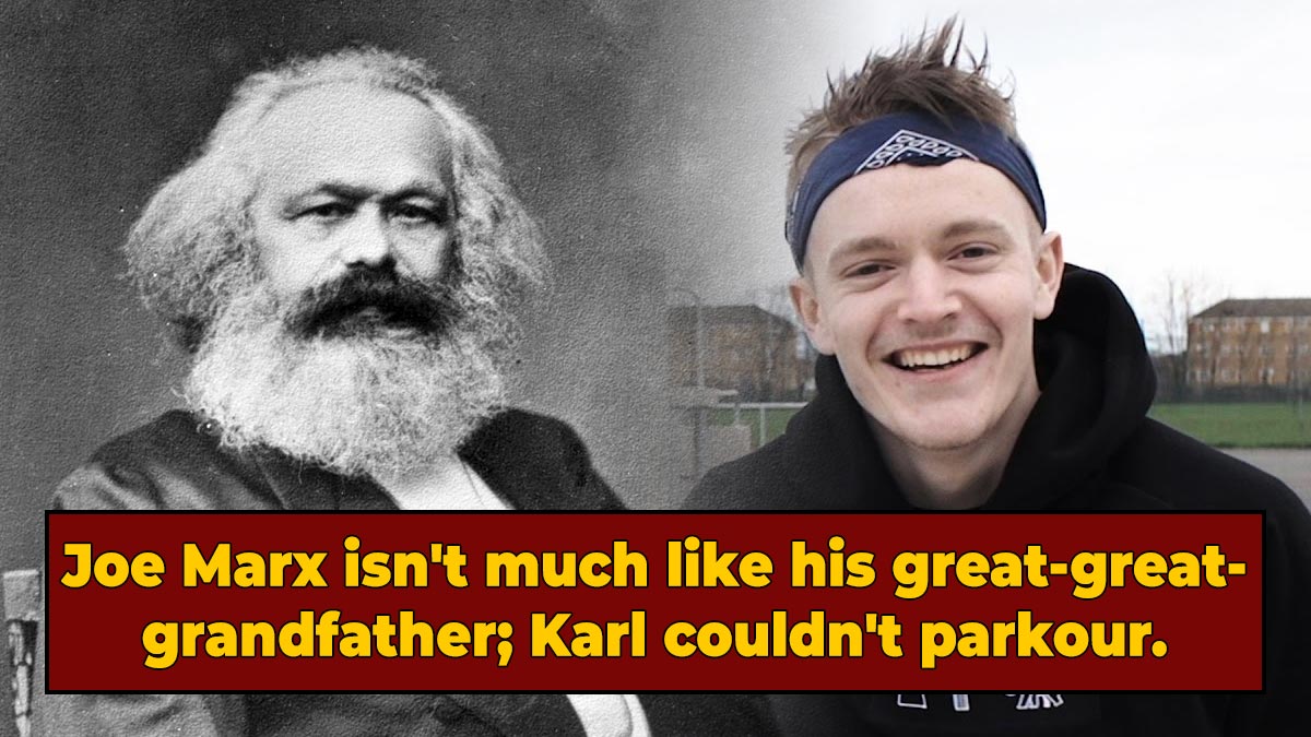 If you're thinking, "Wow, he must be committed to killing capitalism to a life of poverty," that's not the case. Karl Marx himself wasn't poor, but even if he had been, Joe forgoing a 9-to-5 for his famous relative. Joe just really likes parkour.