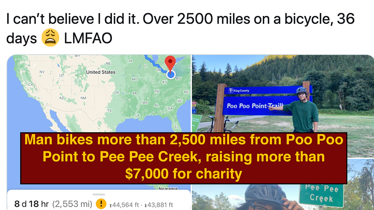 Alright, readers, today's number one (and also number two) story is one for the history books. A man -- no, a true hero -- biked more than 2,500 miles from Poo Poo Point, Washington to Pee Pee Creek, Ohio, to raise money for the humanitarian crisis in Yemen, traveling exactly 69 miles each day of his journey. Nice.