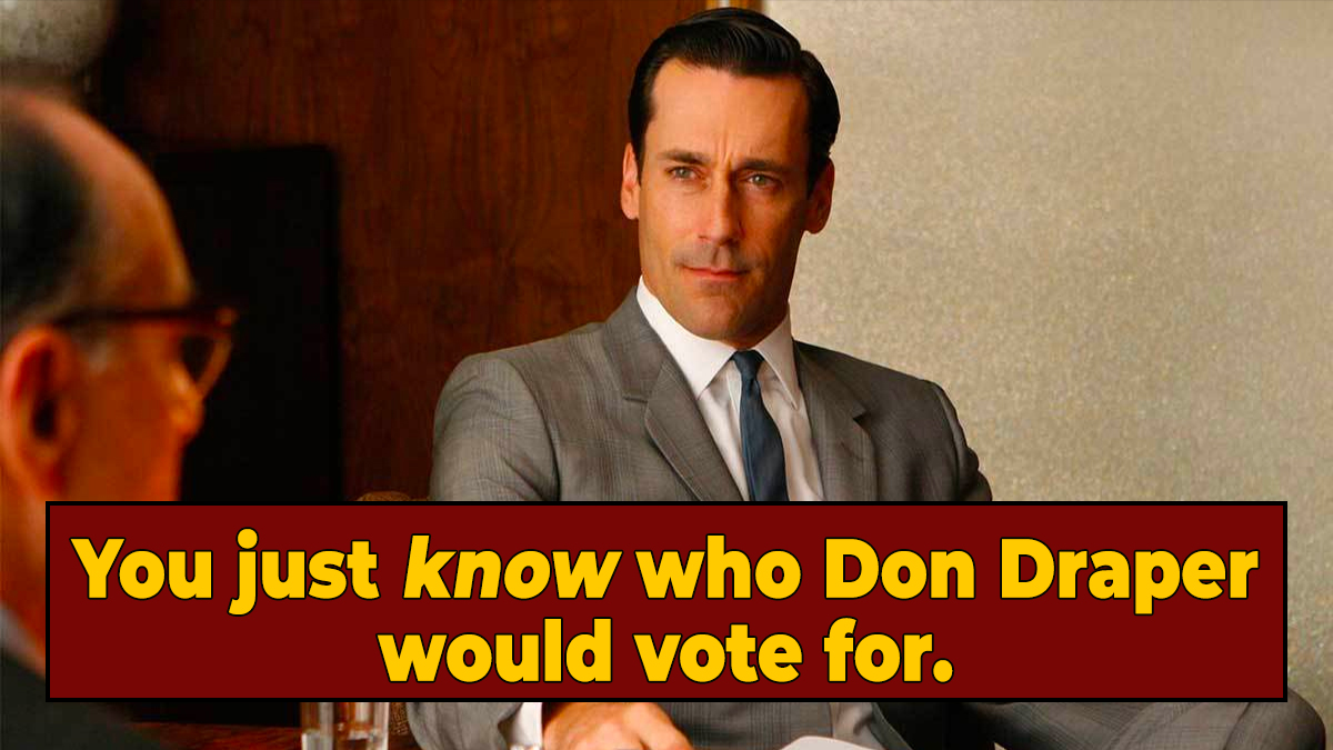 But then factor in how Don Draper would be 94 if he were alive today, and you've got this one pretty much locked up. Republicans have historically crushed it with white voters over 65, and while Joe Biden might now be changing that, Don Draper has all the other demographics Trump kills it with as well. Trump's military disrespect wouldn't even bother him, as "Don" stole a dead soldier's identity to escape active service. If Don Draper isn't voting Trump, then no one is.