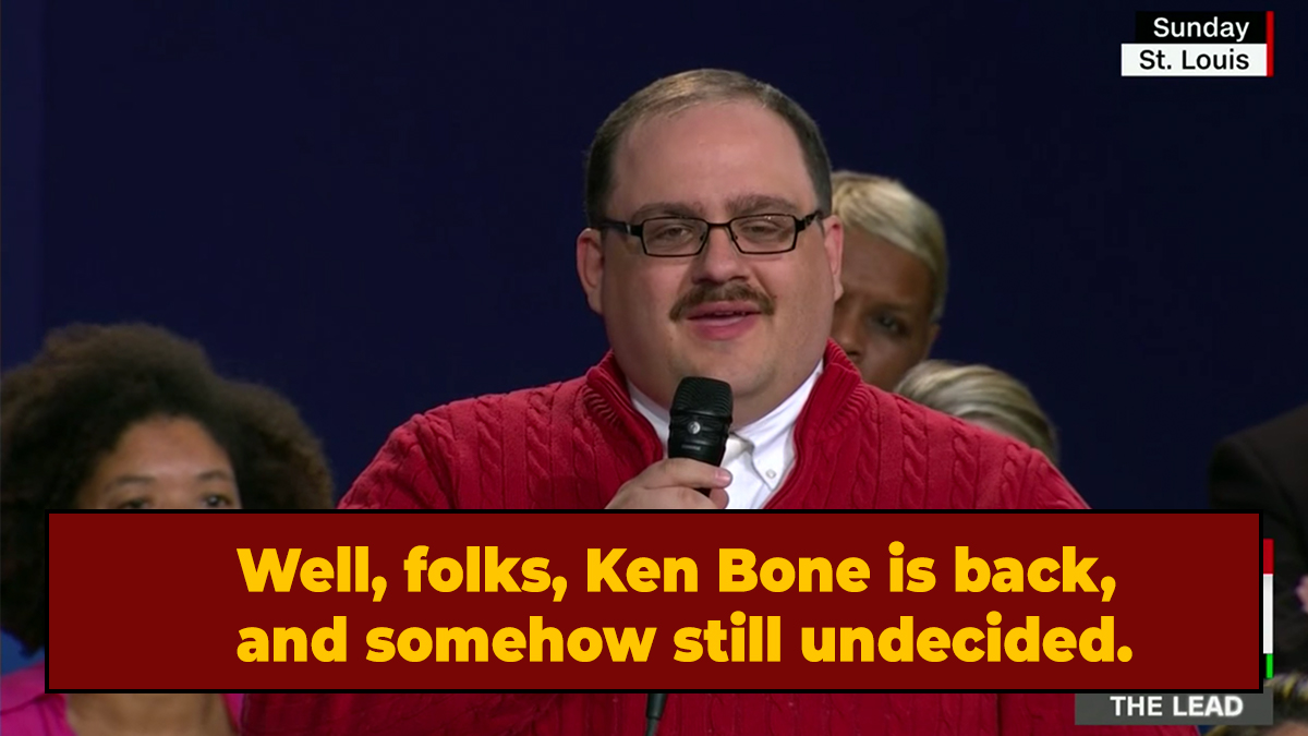 The notoriously vicious presidential debates haven't helped him solidify views, either. "I didn't have a very high opinion of either of them to begin with, so it was hard to lower it," Bone said of the debate. "I think that we kind of got what we expected. In a way, we almost got what we deserved because we've all played our part in raising the temperature of political discourse. It leads to a couple of people who are probably older than your grandparents, yelling at each other and telling each other to shut up, and talking over each other like drunk relatives at Thanksgiving. It was insanity." You're telling us, Ken, you're telling us.