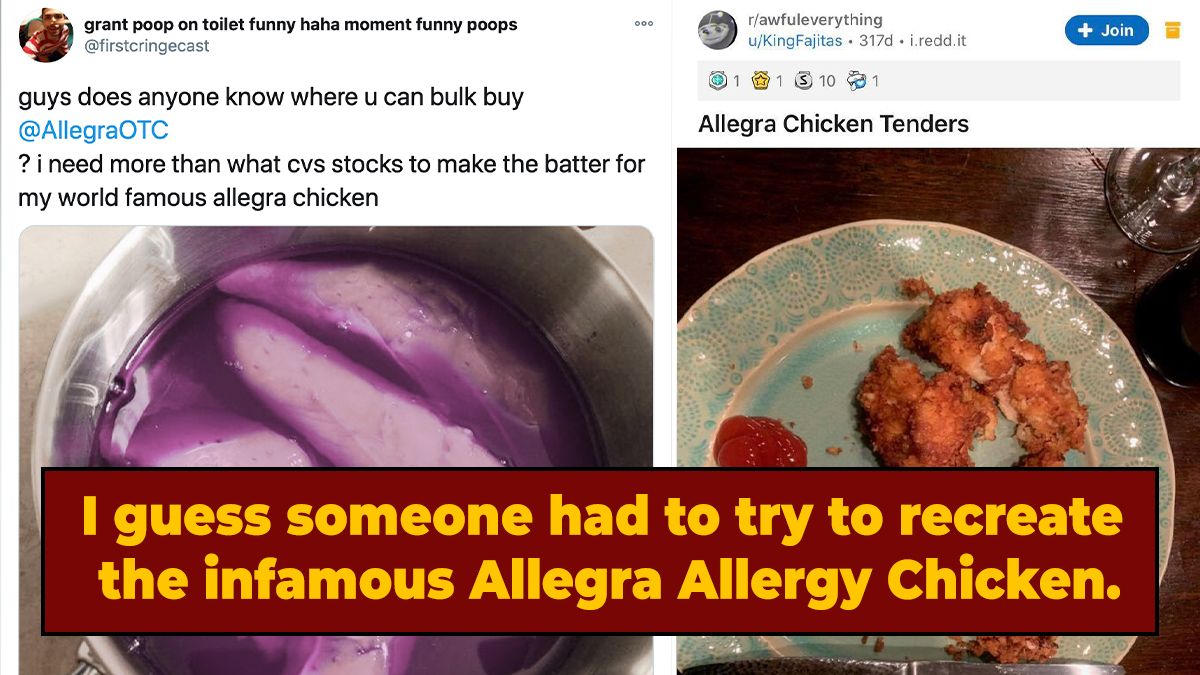 For those of you who don't often find yourself mindlessly scrolling through the cursed annals of Twitter, first of all, congrats on not being the President of the United States or a fellow journalist. Secondly, let me give you a bit of a refresher. Last year, a Twitter user shared an image of what appeared to be chicken breasts marinating in a purple-liquid, posing an important culinary inquiry. "guys does anyone know where u can bulk buy more @AllegraOTC?" they wrote in the since-deleted, yet still screenshot-archived post. "i need more than what CVS stocks to make the batter for my world f amous allegra chicken ." Upon seeing the tweet two days later, Allegra's PR team seemingly wanted nothing to do with the erm, questionable chicken recipe starring their over-the-counter antihistamine. "Hello. Please only take Allegra as directed. Find directions, uses and warnings on our website, here: http://allegra.com/products. We would like to hear more about how you are using Allegra. Please give our Consumer Affairs Department a call at 1-800-633-1610. Thank you."