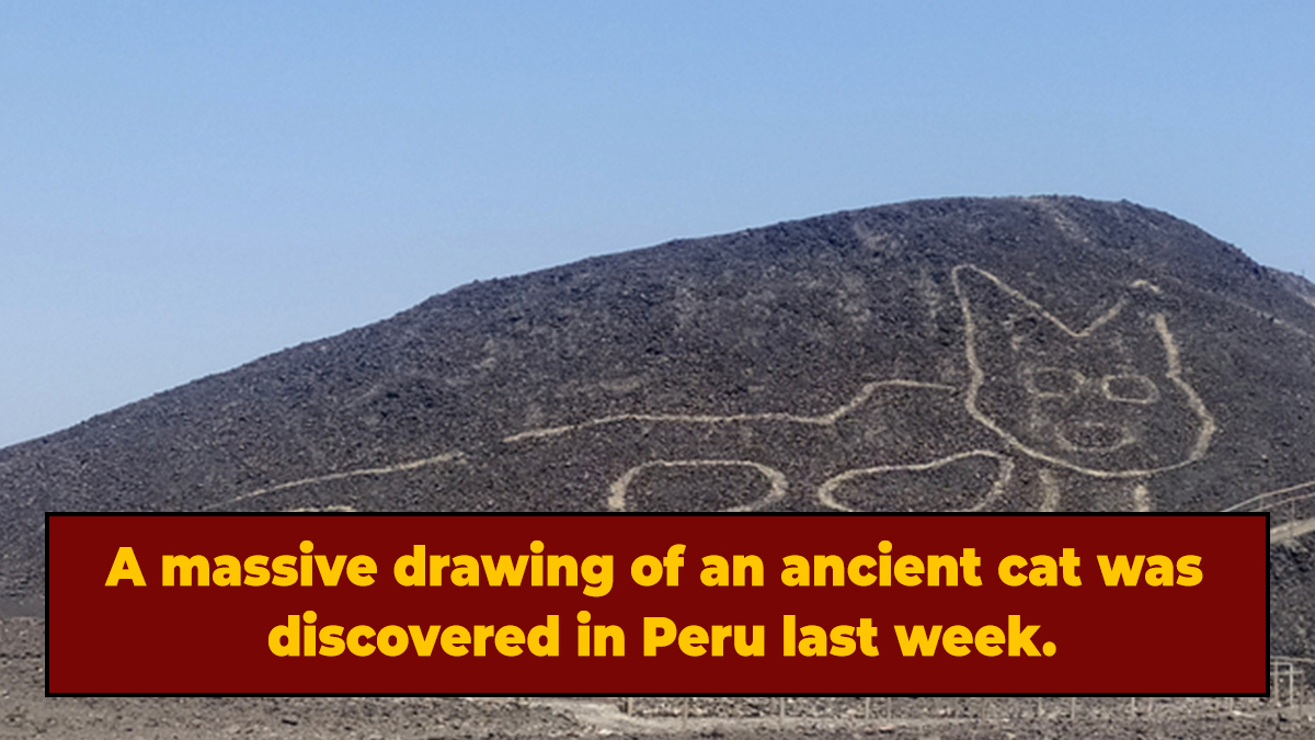 Well, it's not every day you unintentionally stumble across a drawing of a giant cat dating back to pre-common era times, but last week, a group of Peruvian workers did just that. Archeologists remodeling a UNESCO World Heritage site in southern Peru accidentally discovered a 2,000-year-old etching of a kitty cat lying on the side of a mountain, the nation's Ministry of Culture announced last Thursday. The ancient cat is a tall boi, clocking in at 37 meters long (or 121 feet long for us English System-using Statesians), and appears to be engaged in every feline's favorite past time, basking in the sun, sporting big, round eyes, pointy ears, and a long tail. Sounds like a purr-fect way to spend the past two millennia.