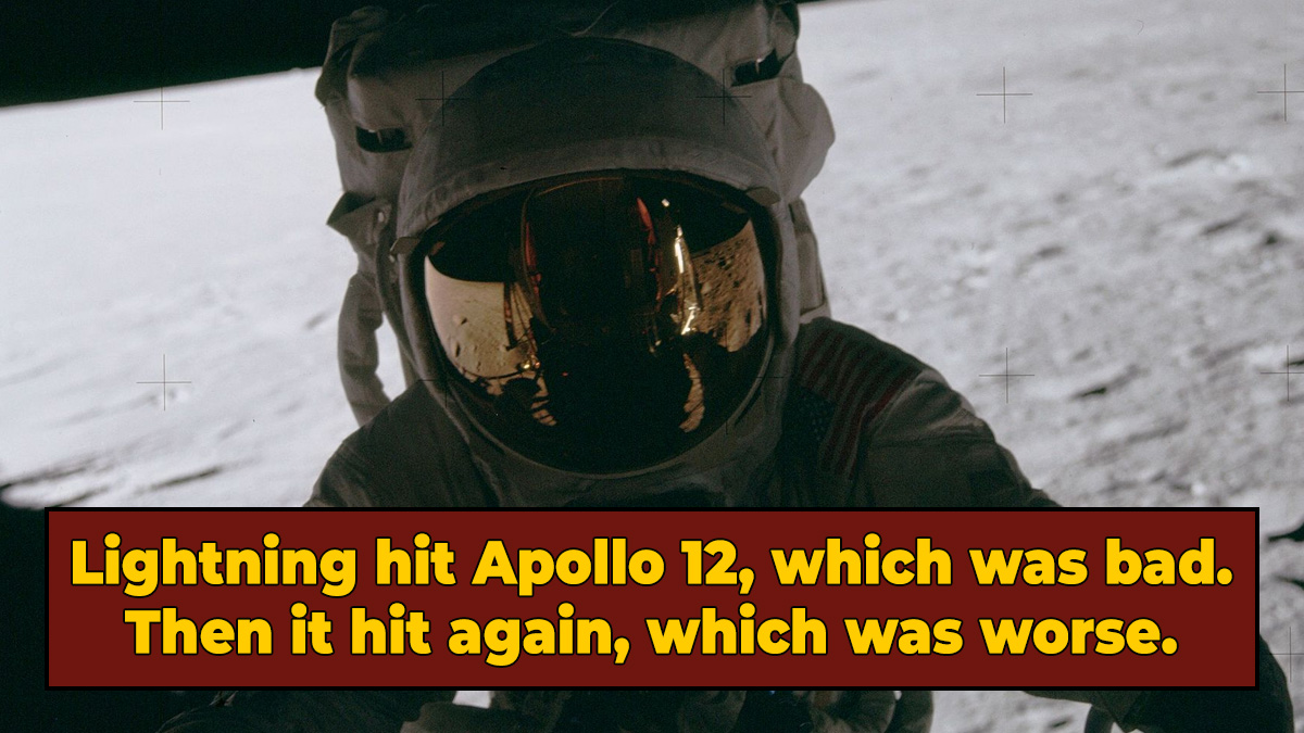 But sometimes, lightning does strike the same place twice. For example, when Apollo 12 took off on November 14, 1969, lightning hit their rocket 30 seconds into their ascent. Then, less than 20 seconds later (and with the spacecraft already having moved another 20 miles or so farther up away from the ground), lightning struck again. In hindsight, we know that these bolts were sent by Zeus, cursing man for his hubris, but at the time, the astronauts had no idea what was going on. It just felt like a massive electrical fault, followed immediately by another one, with catastrophe the obvious inevitable outcome.