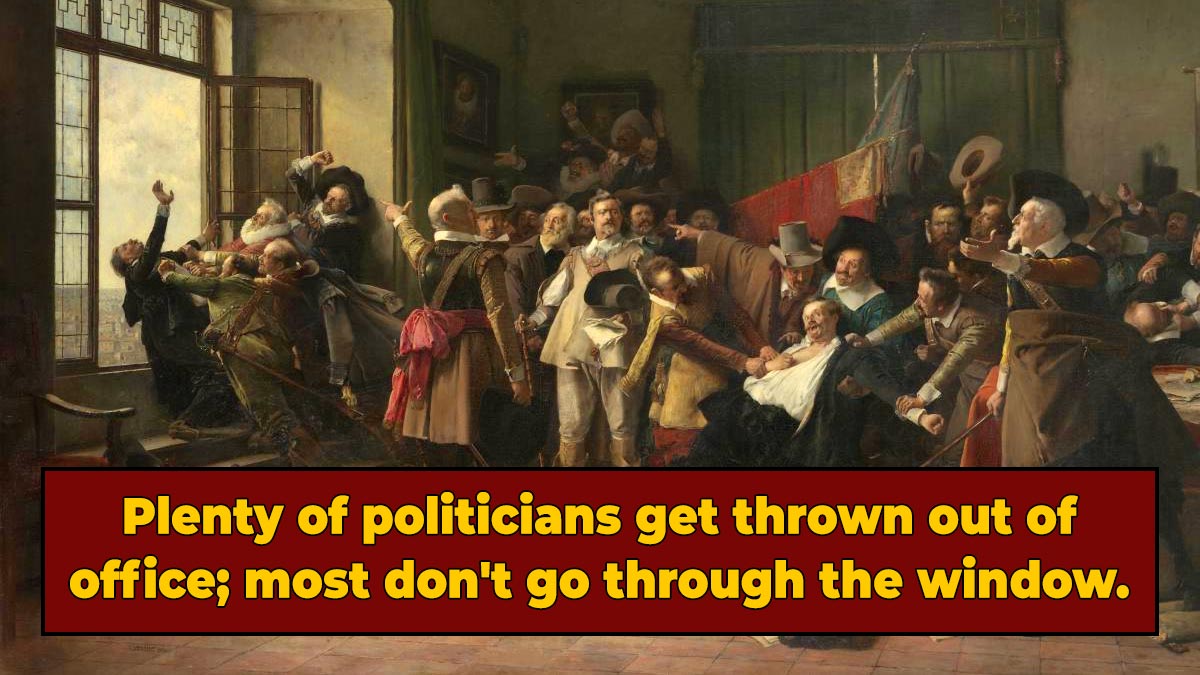 I suppose the moral of this saga is that throwing political figures out of a window results in a peaceful and positive resolution. Well ... at least two out of three times.