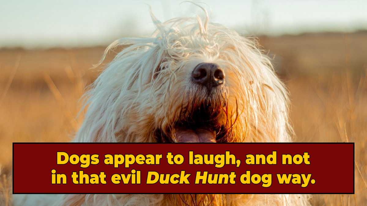 Robert Heinlein famously wrote that "man is the animal that laughs," and it was just one of the many things he was wrong about. Dogs, among other animals, appear to be able to laugh. It doesn't sound like human laughter (leading to nitpicking debates about if it counts as laughter), but it's a specific type of panting they do when they're playing that is scientifically distinguishable from regular old "I am overheated and designed weirdly" panting: