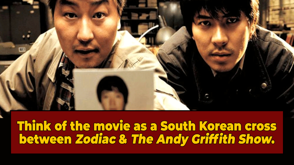 The movie tells the disturbing story of a troubled police investigation into a series of rapes and murders in the 1980s -- think of it as a cross between Zodiac and The Andy Griffith Show, but set in South Korea. If that didn't sell you, it also stars regular Bong Joon-ho collaborator Song Kang-ho, back when he was young and not yet a meme.