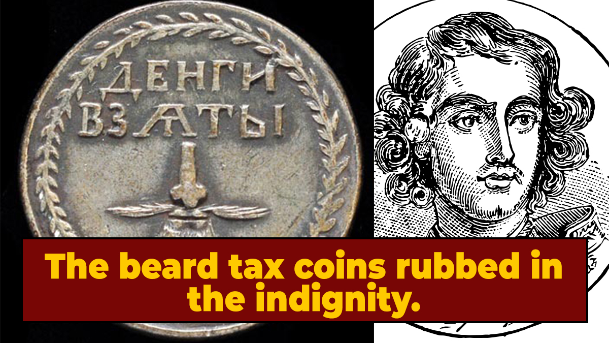 A beard tax seemed like the logical next step in Peter's grand debeardification of Russia. To his credit, he was flexible on how much he'd shake you down: The richest men of Russia were fined 100 rubles per year to keep their beards, while government lackeys got away with 60 and common men were only charged a single copeck whenever they came in and out of town. And there was no sneaking: A guy was stationed at the gates of every city in Russia to check everyone's beard papers.
