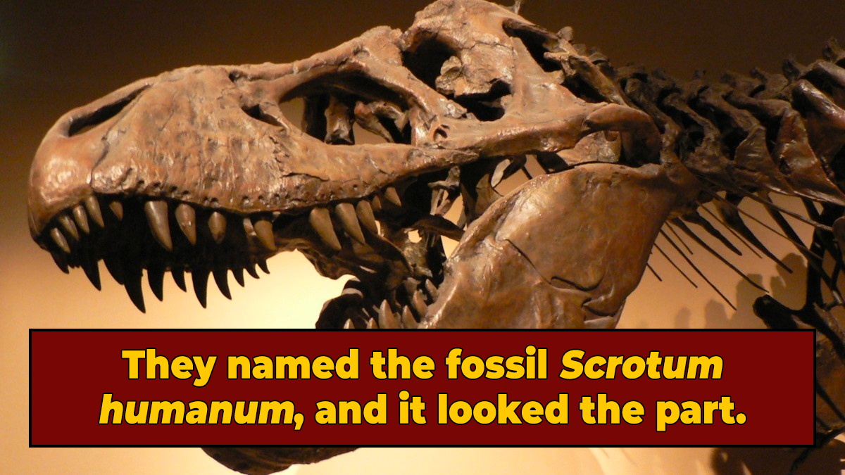 Brookes was almost certainly just having what passes for a laugh to scientists, but for a lot of boring reasons having to do with the timing of decisions in the taxonomical community, it became the first official dinosaur name. Its tastelessness became the subject of various appeals to the incredible dorks that must populate the International Commission for Zoological Nomenclature, who must hate fun because they struck down any attempt to properly immortalize the Scrotum humanum. Although, to be fair, no one is totally sure which species it even was. They're pretty sure it was a Megalosaurus, but someone lost the ancient dinosaur ballsack, so we can't confirm. At least there's a clear villain in this story.