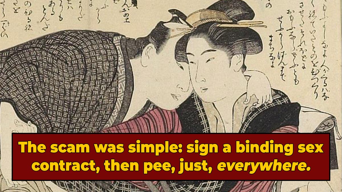 For the pee scam to work, the mistress broker and a beautiful girl had to have been working together. She'd be introduced to a sugar daddy, flash him her knee or whatever was considered taboo in Japan back then, and the feudal lord would pay the broker a massive finder's fee. They didn't mind. For one, most of their blood wasn't in their heads at the time. The client and the mistress would sign a contract, and, in most cases, she would be given her own accommodations where the client would visit and often spend the night. The next phase of the plan involved collecting as much money as possible from the mark, in addition to the payout, the woman's partner got earlier. Maybe she needed a new kimono, or maybe she got a letter from a prince in some African country who really needed her help freeing his funds. In any case, the mistress would attempt to bleed her sugar daddy dry (in addition to relieving him of other bodily fluids.)