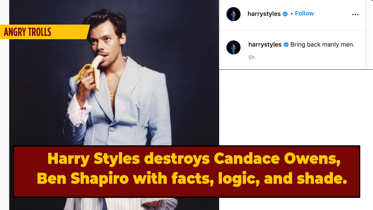 Despite managing to get royally dunked on by a former boy band member, it seems Candace Owens has essentially missed the point. "When people try to tell me I don’t have influence, and then @Harry_Styles dedicates an entire post to my tweet. I inspire a global conversation. #BringBackManlyMen Shots fired," she wrote, adding a row of cry-laughing emojis and a screenshot of Styles' Instagram post.