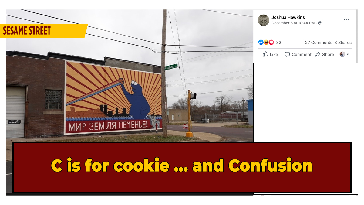 It's a mural mystery, rife with identity theft, alleged graffiti, and of course, a massive Soviet-inspired Cookie Monster. Last week, artist Joshua Hawkins says a local landlord named Nate paid him "a good amount" to paint a massive portrait on the side of his Peoria, Illinois building, featuring Cookie Monster holding a rainbow-beaming cookie over the town's skyline above Russian text roughly translating to "World. Earth. Cookies." Nice. Yet it seems our Slavic Sesame Street Star's Peoria appearance was short-lived. Days later, the painstakingly detailed mural was no more, concealed in a thick coat of white paint. The perpetrator? Nate Comte, the building's actual infuriated landlord, who maintains he gave Hawkins no permission nor payment to adorn his brick building with the blue beast's image.