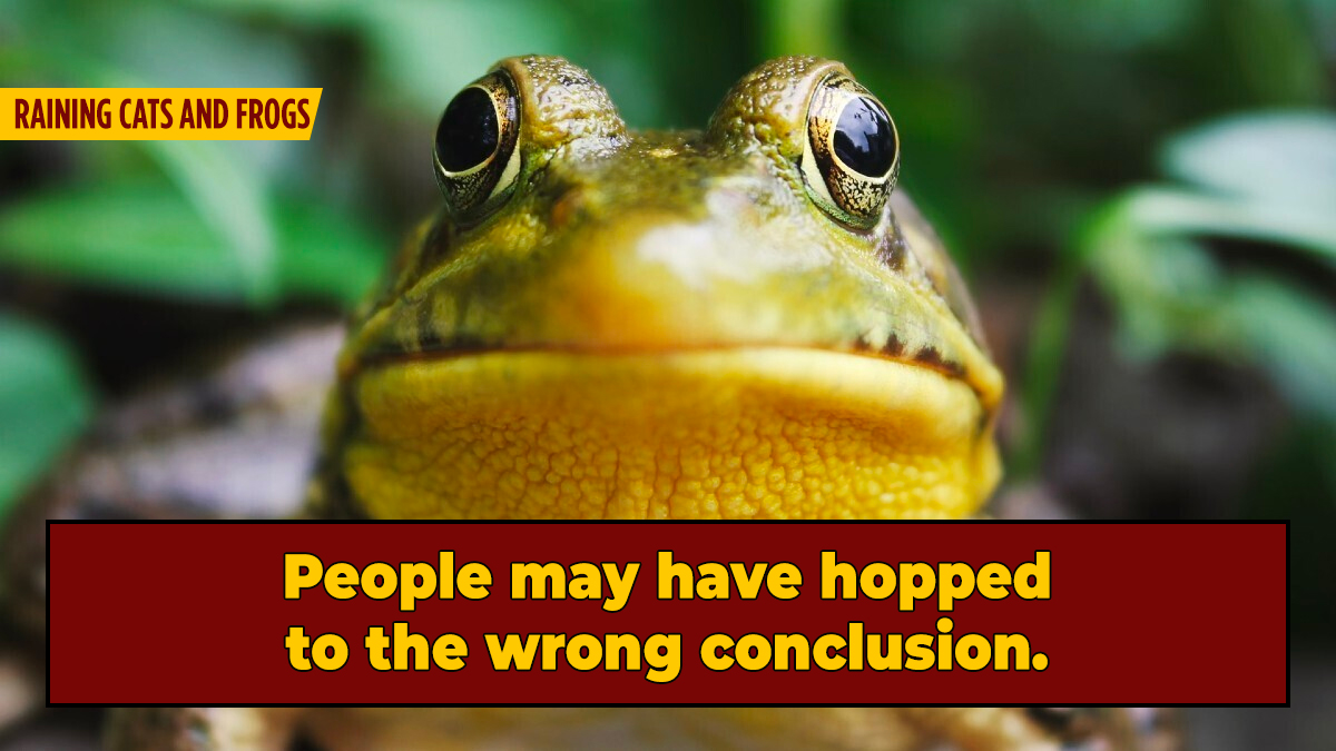 ... to real life when the weather is bullshit, always bringing with it a sense of foreboding, since it was just one way God punished the Pharaoh who refused to end Jewish slavery in Egypt (and it's just generally not cool when things that aren't water come out of the sky). It might not have looked the way we think it did, though. It's usually depicted as a storm of frogs that seemingly come from nowhere to move into your bed, kitchen appliances, and dishes, but according to one translation, it was actually just one frog that "arose and covered the land of Egypt."