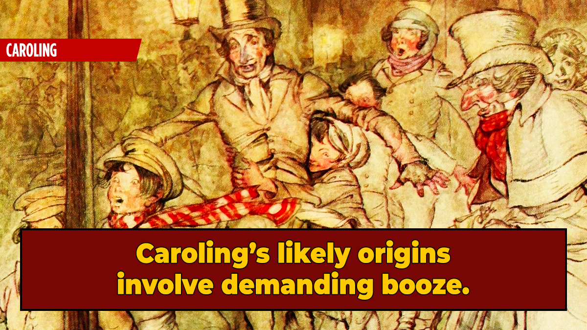 Today, only the most desperate of theater kids go door-to-door to sing at people on the pretext of holiday cheer, but in the before times, it was more like trick-or-treating for Jesus. Christmas caroling likely has its origins in the ancient pagan customs of wassailing and mumming, which have slightly different traditions, but both involve knocking on doors to demand the occupants' booze.