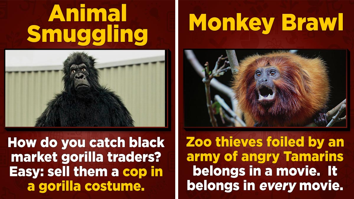 Zoo robbery sounds like something Captain Planet would half-ass a fight against in an episode that's 90 percent Planeteer whining. But it's actually one of the fastest growing crime problems in the world. It's getting to the point that you can't step into the average nature reserve without a guy in a ski mask running past, screaming and clutching an enraged pelican. And not every theft is as charming as the time a stolen lemur wriggled away from his thief, escaped to a local playground, and was discovered by a lemur-loving five-year-old. This is a serious problem. Consider, for example ...