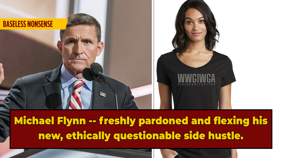 Fresh off of his presidential pardon, it seems former United States National Security Advisor, Michael Flynn, has a new lease on life, using the time he likely once reserved for navigating his self-inflicted legal troubles to embark on a highly-lucrative new business venture -- selling crappy QAnon merch. On Tuesday, Flynn took to Twitter to promote his collaboration with aggressively patriotic apparel company, Shirt Show USA, and their new official #FightLikeAFlynn collection, which aims to raise capital for his newest media endeavor.