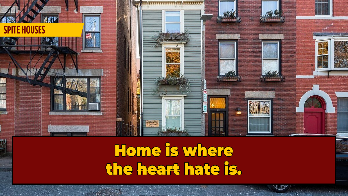 Another common spite house theme is landowners, offended that a neighbor refused to buy their adjoining small plot of land or offered an insultingly low price, building inconvenient structures on the plot as a sales tactic, often resulting in hilariously tiny homes, and not the HGTV kind. The Sam Kee Building in Vancouver, which is the narrowest commercial building in the world and somehow houses various offices and shops, falls into this genre of spite house. Another houses an interior design firm in West Cambridge, Massachusetts (you might have noticed that state popping up quite a bit, committed as they are to all manner of jerkery):