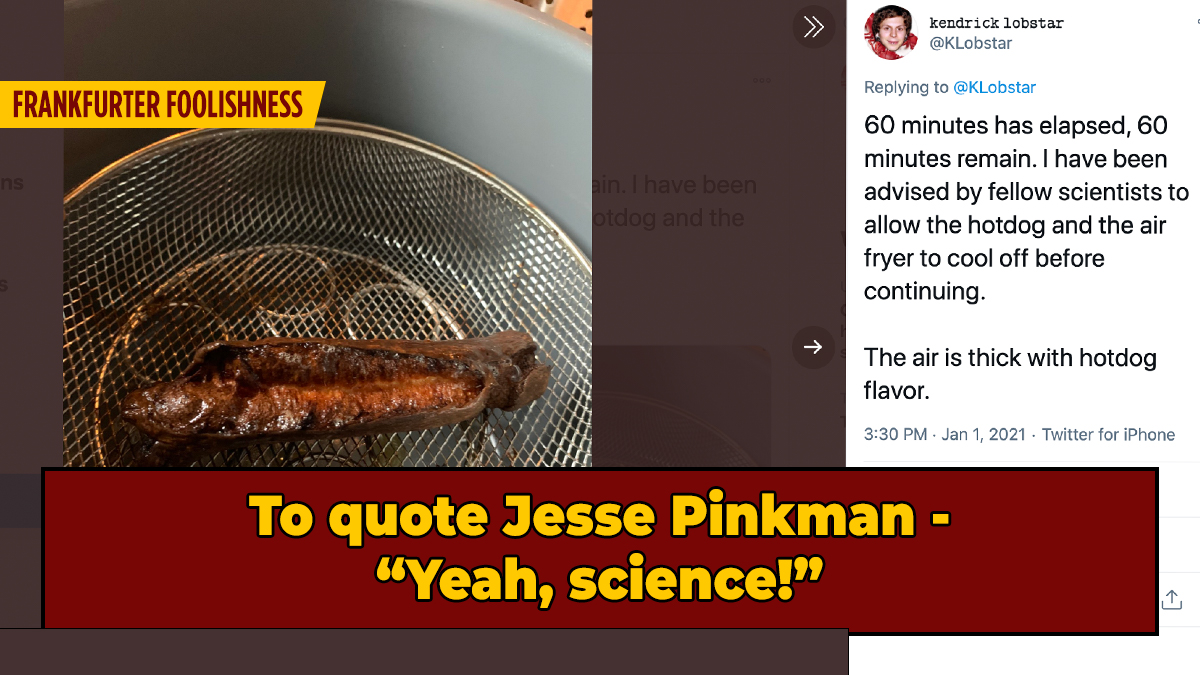 While the majority of us nursed the hangover from a Zoom New Years Eve's party (or, well, from polishing off a bottle of two-buck chuck while watching Mr.305 perform to a mostly empty Times Square and a handful of heroic first responders #dale), Twitter user @KLobstar embarked on a mission to air fry a single hot dog for two hours, for no reason other than just to "see what happens."