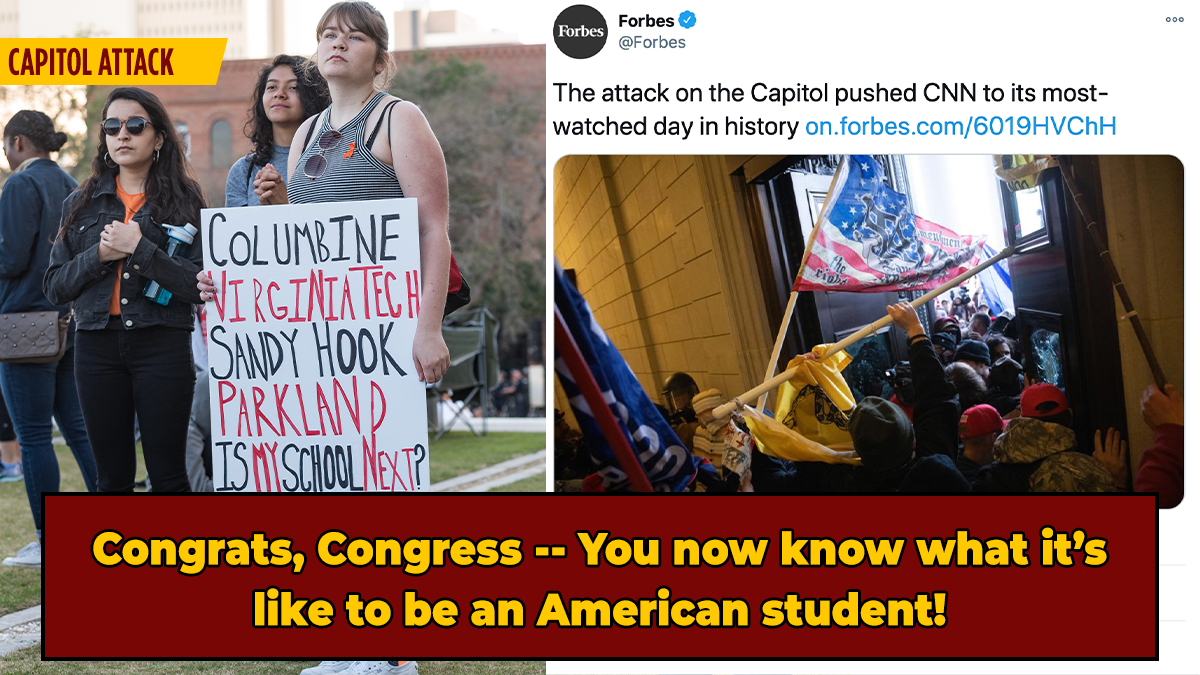 Congressional representatives -- they're just like TikTok teens? As rioters attacked our Nation's Capitol on Wednesday, several government officials inadvertently completed a gut-wrenching rite of passage familiar to nearly every American student -- weathering the visceral terror of a lockdown. Since Columbine, more than 187,000 students have experienced a school shooting as of 2018, according to The Daily Beast, as most schoolchildren regularly partake in active shooter drills, which some experts say is an ineffective, scarring measure, furthering the anxiety-inducing idea that unspeakable acts of violence can happen even in theoretically safe, educational settings.