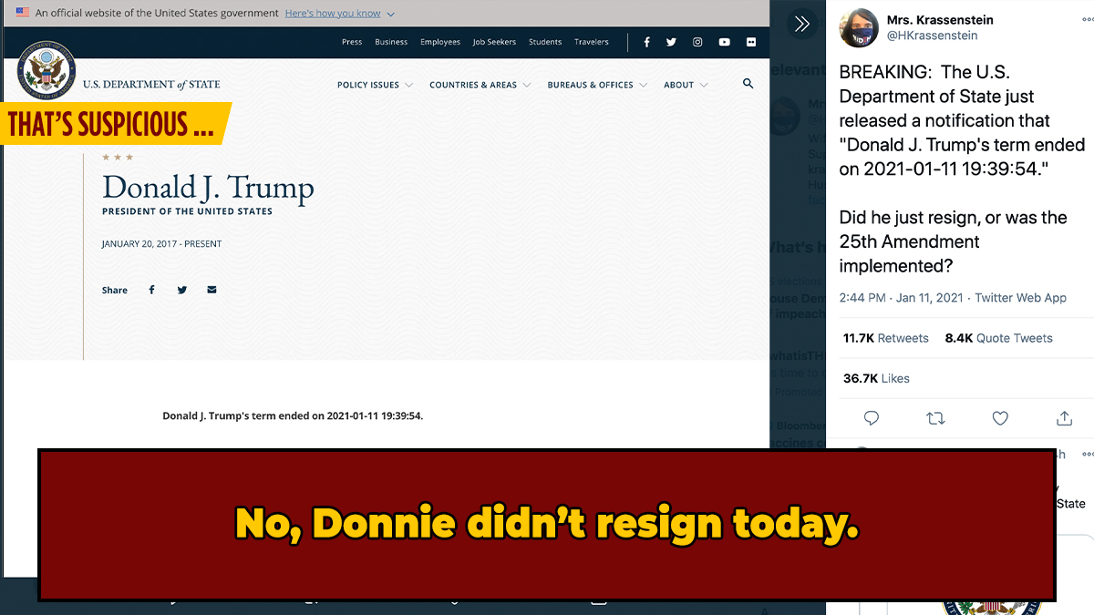 Well, folks, it seems Twitter, Congress, and some karmically-inclined universal forces aren't the only ones absolutely trolling soon-to-be-ex-President Donald Trump. Earlier today, The United States' State Department website experienced a "glitch" (or an intentional jab from a "disgruntled employee"), incorrectly reading that Donnie's time in office "ended" at 7:40 p.m. ET on Monday, January 11, CNET reported.