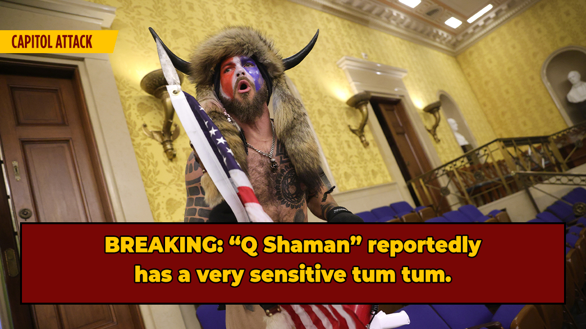 On today's episode of absurd insurgent entitlement, it turns out that ridiculous requests along the lines of "no red M&Ms" aren't only reserved for rockstars or, well, allegedly world-famous drag queens. It seems one rioter who reportedly participated in Wednesday's deadly act of domestic terrorism can also have a diva-esque demand -- all from the comfort of their jail cell. Jake Angeli a.k.a. Jacob Chansley, a.k.a. the buffalo head-clad "QAnon Shaman" who was arrested on Saturday for his involvement in last week's capitol siege is now on a hunger strike -- not to further a political cause, but because prison food apparently isn't organic, Complex reported. Since being taken into custody, Angeli, who now faces several charges including disorderly conduct and violent entry, has allegedly refused to eat anything at the Arizona detention center where he is being held, at least according to Martha Chansley, Angeli's mother and potential roommate.
