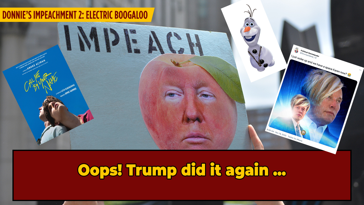 Yesterday, Donald J. Trump made history as the first President in The United States's 244-year existence to be impeached twice during his tenure, or, well, fourure, in the Oval Office. With only two of our country's other 44 presidents having also faced impeachment, Andrew Johnson in 1868 and Bill Clinton in 1998, Donnie managing to pull this off not once, but on two separate occasions is truly astounding, a testament to his erratic and often irresponsible approach to leadership. To paraphrase Phineas and Ferb supervillain, Dr. Doofenschmurtz -- "Wow, if I had a nickel for every time Donald Trump was impeached I'd have two nickels - which isn't a lot, but it's weird that it happened twice."