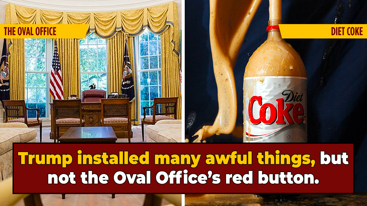 If you've been floating along on a Leslie Knopian cloud of relief ever since Biden's election and the words "Diet Coke button" mean nothing to you, we really hate to ruin this for you, but many people are only now becoming aware of the existence of a red button on the famous Resolute Desk in the Oval Office that former President Trump used to summon a butler carrying a bottle of Diet Coke on a silver tray. He also sometimes let people think it was the button that launches the nukes and scared the hell out of them. Even a broken clock tells a good joke exactly once.