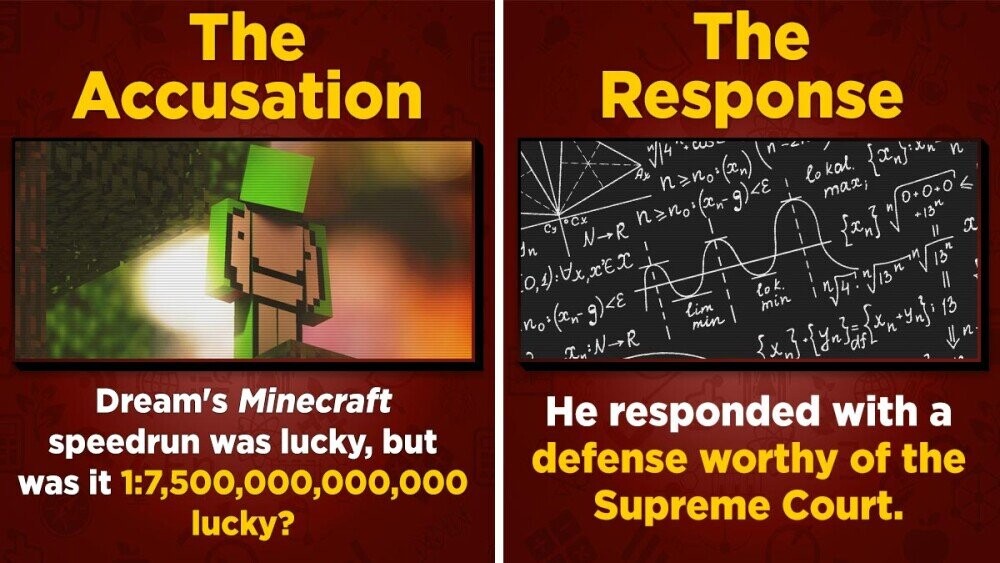Mods also based their statistics on the lucky event happening to someone who also happened to be a top 1,000 speedrunner who also happened to be streaming while the lucky events took place, rather than the odds of this happening to anyone playing Minecraft. Dream alleges that this unfairly biases the data against him, as that would dramatically decrease the odds of that being the case because of the nature of the specificity.