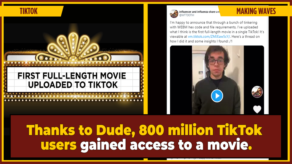 Move over, pandemic-afflicted theaters, HBO Max with Warner Bro's entire 2021 slate, and Netflix's plan to churn out weekly movies -- it seems TikTok-ing hackers may have found an entirely new way to tailor the movie-going experience to the, erm, very unique needs of 2021, cramming feature-length movies and TV shows into what should theoretically be 60-second social media clips.