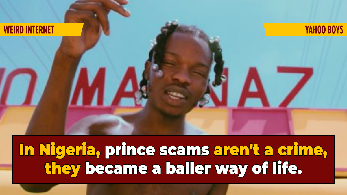 And they're not just a bunch of ashy nerds sitting in a basement tricking tech unsavvy First Worlders into buying them Dogecoins. Okay -- a lot of them are. But yahoo-yahoo (online fraud) is a big organized crime-business in Nigeria. Yahoo boys form crews, bribe officials, and execute corporate heists for tens of millions of dollars like they're in a Very Online Ocean's 11 crew. Their "distinctive lifestyle" has also made them celebrities in Nigerian culture. The biggest Yahoo boys boast about their luxury cars, private jets, and off-shore bank accounts to their millions of followers on Instagram. There have even been Billboard charting songs written about that Yahoo Boy life -- much like the Mexican cartels' narcocorridos, except less about decapitating a whole village and more about tricking a grandma out of 800 bucks.