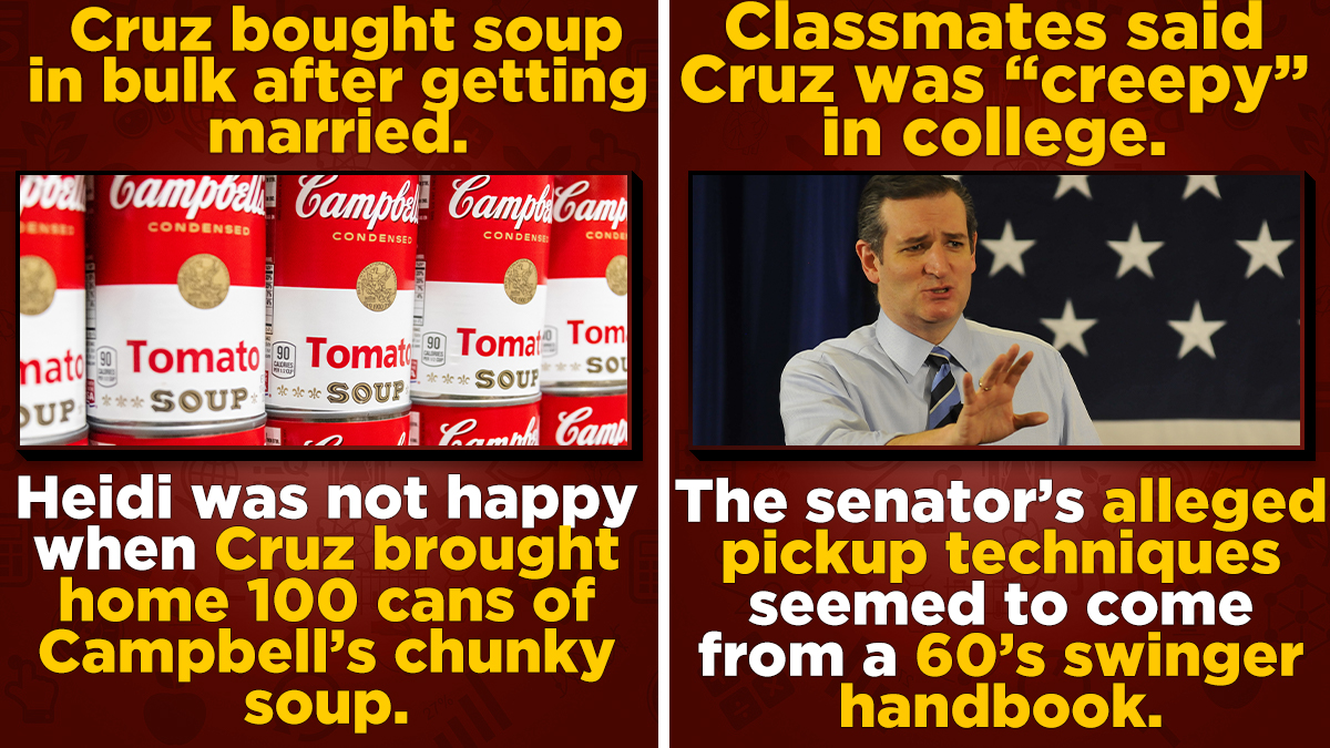 Weird roommate interactions aside, it seems the senator has a strange penchant for uh, canned soup? Shortly after he and Heidi returned from their honeymoon, the new Mrs. Cruz was in for a soupy, bulk-buying surprise that would put some of the scarily savvy shoppers of TLC's Extreme Couponers to shame. "When I married Ted, we got back from our honeymoon, and he went off to the store and came home by himself. And I was completely shocked to see that he arrived back at our apartment with literally 100 cans of Campbell's Chunky soup," Cruz, who worked in former President George W. Bush's Cabinet said of her apparent man-child of a husband's eating habits during a 2016 CNN town hall. "I never bought 100 of anything."