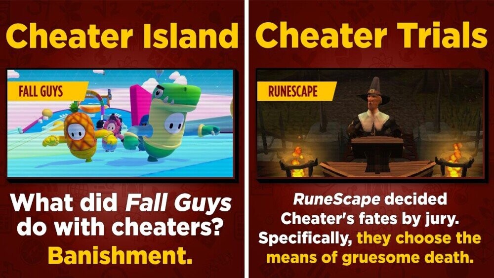 In 2012, the developers of the seemingly harmless MMO Runescape created Botany Bay, a place meant just for bot-using cheaters to be tried and punished for their crimes. The game would teleport cheaters to the secret island where cheaters would meet the aptly called Botfinder General. There would be a hearing, and other players wouldn't get to pick the verdict because it would always be guilty, but they got to pick the punishments the cheaters would face. So, after the mandatory "throwing of crap" ...