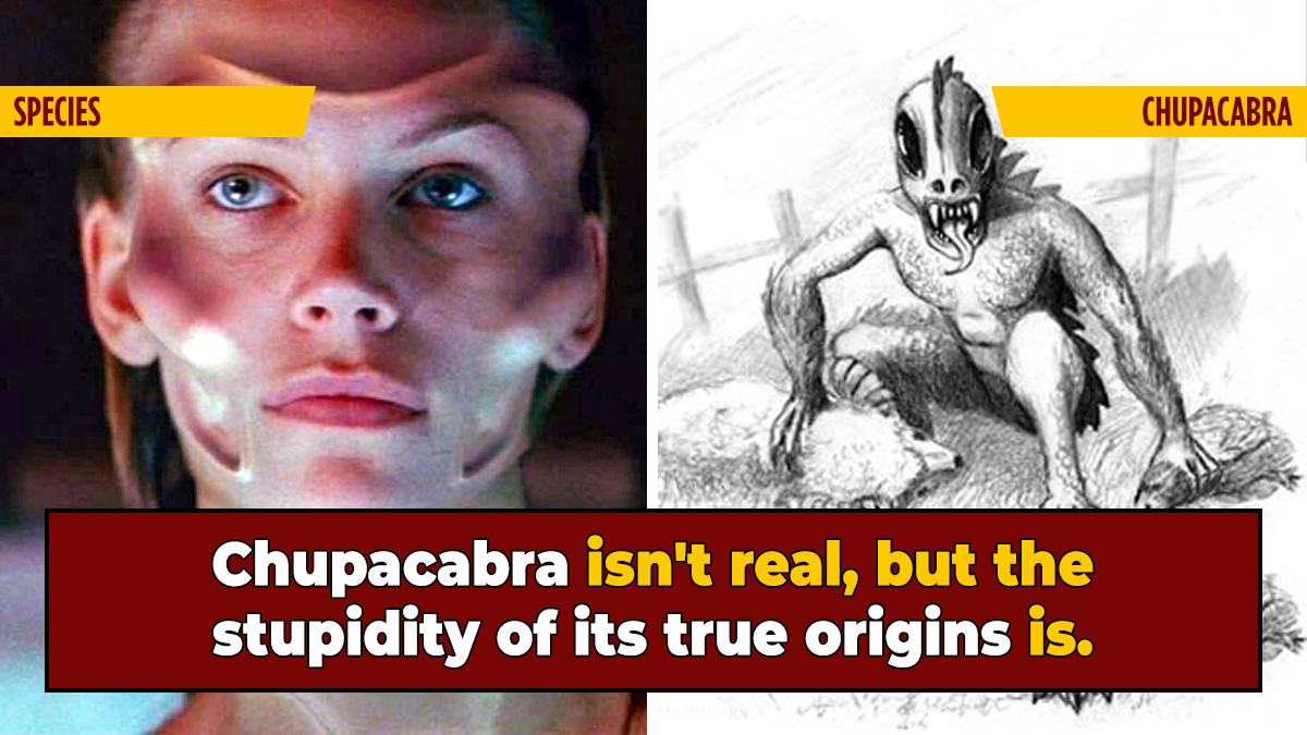 It may not surprise you that Chupacabras aren't real, but even skeptics might be taken back by just how shockingly stupid its true origins are. It turns out that this mythical beast owes its existence to ... Species, the 1995 erotic sci-fi horror movie starring Natasha Henstridge and Ben Kingsley. For those who don't remember, Species was about a beautiful killer alien who trolls Los Angeles for men to mate with, presumably because she's from the planet Skinemax. And audiences paid good money to see it because in the days before the internet, sometimes cringey Alien rip-offs were the only way to obtain even fleeting glimpses of nude women.