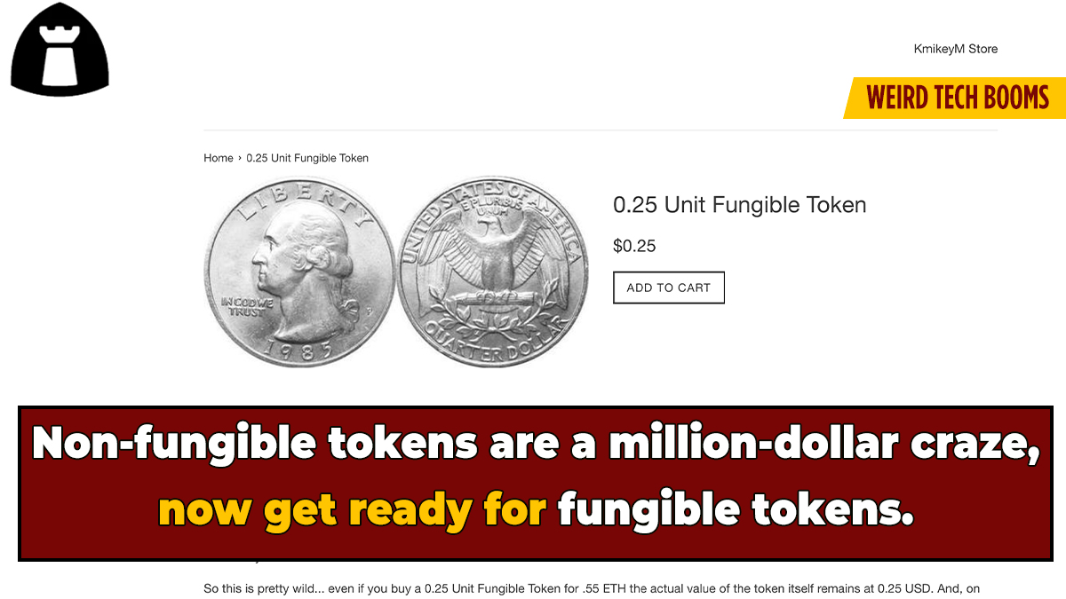 This description even noted the FT's novel analog qualities. "So this is pretty wild... even if you buy a 0.25 Unit Fungible Token for .55 ETH the actual value of the token itself remains at 0.25 USD. And, on top of that, this is all done off chain and with no smart contract." A quarter? without blockchain?! Technology has officially gone too far.