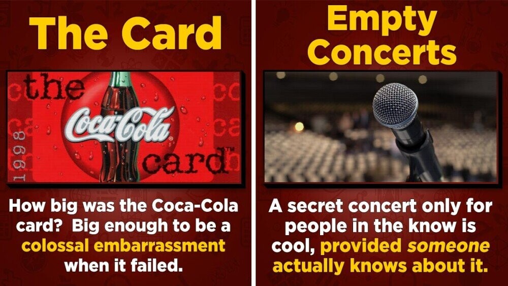 IYDKYDG presented Coke Card carriers with the chance to attend exclusive events, including a series of secret concerts featuring the likes of Everclear, Smash Mouth, and Talib Kweli, where the price of admission was a single can of Coke. Trouble is, IYDKYDG worked so well that nobody actually knew what or where they were supposed to know or go. Recounting the tour as "the dumbest shit I ever did in my life," Kweli told Pollstar in 2003 that because nobody knew how to attend the free concerts, promoters had to stand outside and beg people on the street to attend. Even the entry-level Times Square comics hawking "free" stand-up comedy shows do a better job at disappointing strangers.