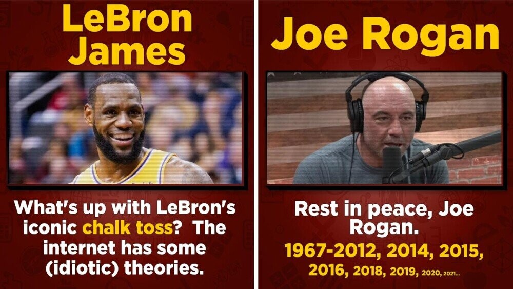 Most of these death hoaxes - of which there are so many that we're surprised it doesn't have its own Wikipedia page - have something to do with Rogan overdosing on either marijuana or psychedelics, just because he advocates for it. It's dumb because we all know that's not how weed or shrooms or DMT work, but this is what you can expect from Rogan fans who have no problem spreading false information, just like he does. This kind of trolling is what they regard as "edgy humor," and if they can fool just one person into thinking Rogan actually died, they can happily jerk off for the rest of the day while listening to him talk about eggs spiked with psychedelics or whatever.