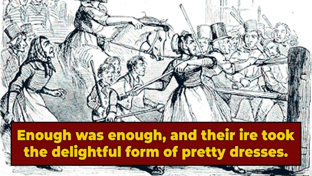 Honestly, more violent riots should incorporate unnecessary theater. It was certainly effective: Between 1839 and 1843, the drama queens destroyed every toll booth and gate in that mother, and everyone was so afraid of them that even their landlords agreed to negotiate lower rents. There are, to be sure, few things scarier than a man willing and able to do some serious property damage while in heels.