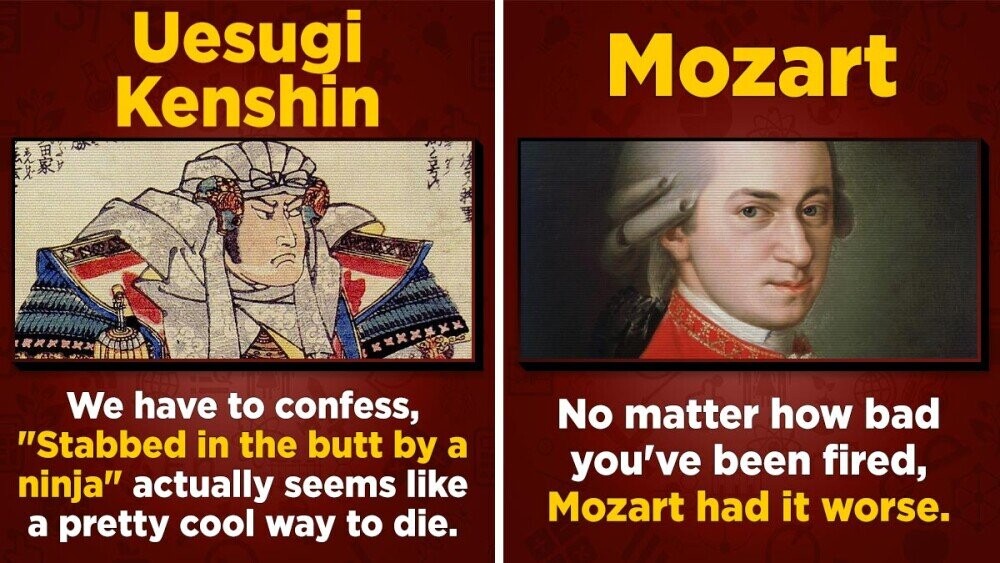 Kenshin and Nobunaga started staring daggers at each other around 1576 when the latter grew in power and influence, having won numerous battles and beating enemies with armies five times larger than his. But Kenshin was himself a brilliant general, and during the Battle of Tedorigawa, he dealt a massive defeat to the Oda army. Not losing momentum, he started gathering troops for a larger assault on his rival that could have seen Nobunaga killed and Japan's history completely altered. But then Kenshin suddenly died. Some sources say from cancer. Others say from a ninja attack while he was in the toilet.