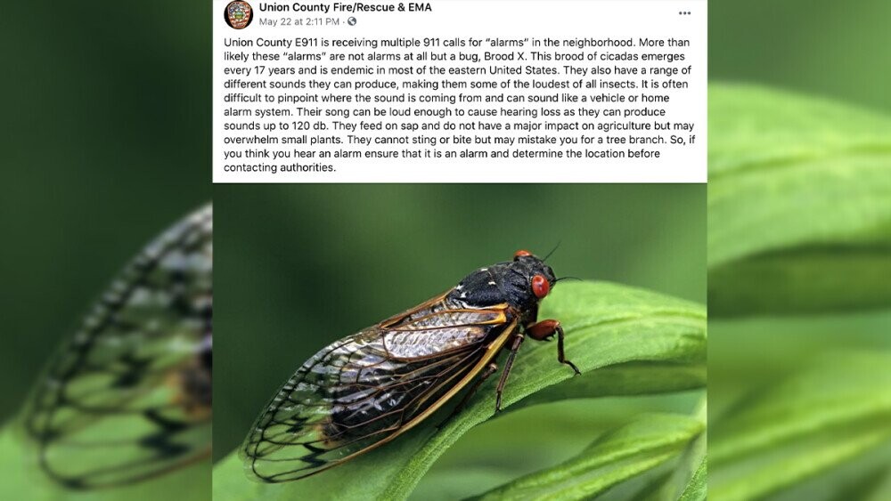 “This brood of cicadas emerges every 17 years and is endemic in most of the eastern United States,” the states Union County Fire/Rescue & EMA explained in a Facebook post. “They also have a range of different sounds they can produce, making them some of the loudest of all insects. It is often difficult to pinpoint where the sound is coming from and can sound like a vehicle or home alarm system. Their song can be loud enough to cause hearing loss as they can produce sounds up to 120 db. They feed on sap and do not have a major impact on agriculture but may overwhelm small plants. They cannot sting or bite but may mistake you for a tree branch.”