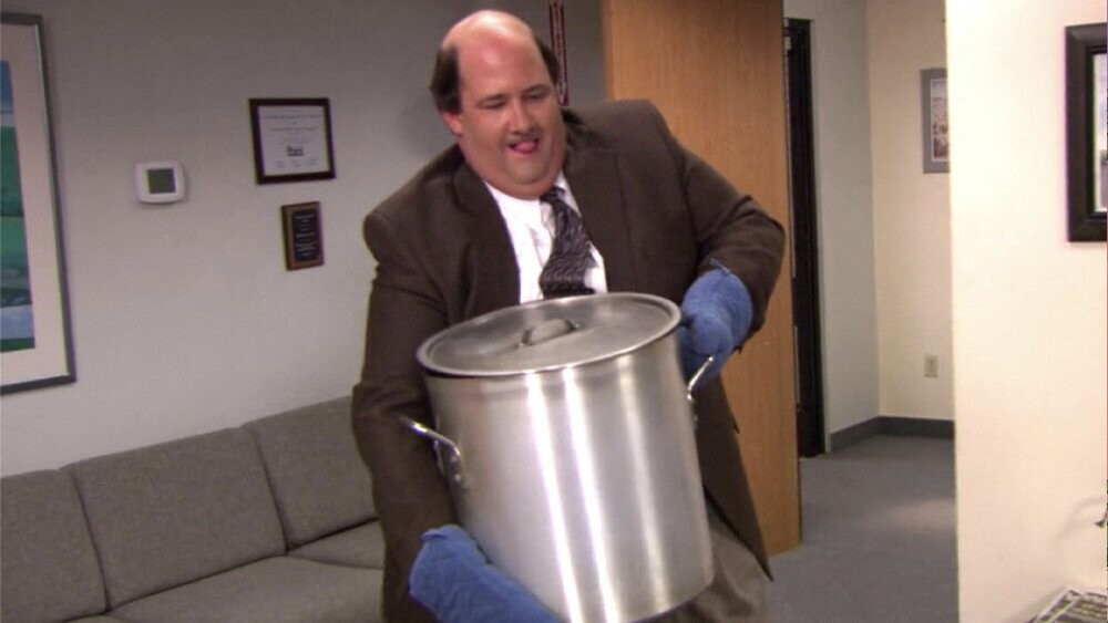 Although finding the gag solely comical may be the mark of a Patrick-Bateman-level psychopath, it seems the demise of Kevin's chili was somehow almost a hell of a lot worse. Back in the glorious whipped-coffee and DIY sourdough-filled days of March 2020, Andy Greene, author of The Office: The Untold Story of the Greatest Sitcom of the 2000s: An Oral History shared an original draft of the scene penned by writer Aaron Shure on Twitter. This version paints a much bleaker picture of Malone attempting to navigate his unfortunate spill, turning to a clipboard, a mug, and even his own two hands to put the chili back in the pot before ultimately giving up, grabbing papers from a nearby trash bin to sop up the mess.