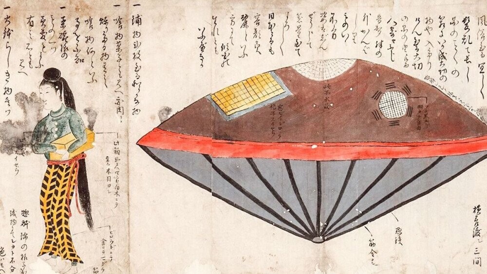 On February 22, 1803, a strange object was spotted in the waters off the coast of what's today Ibaraki Prefecture, eastern Japan. Pulling it ashore, the local villagers struggled to describe the thing's shape. The closest they got was comparing it to something like a Japanese incense burner or maybe two shallow bowls put together. Fortunately, here in the 21st century, we have so many more words. We have so many words that we now have names for BS stuff that doesn't exist, like "sigma male." The point is, we can accurately describe how the mysterious object looked like: it looked like a flying saucer.