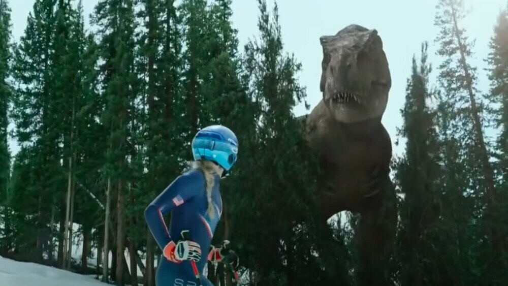 Most oddly, at one point, skier and two-time gold medalist Mikaela Shiffrin is threatened by a velociraptor, and later a T-Rex. But, for some reason, the majestic theme music continues playing, which just makes it seem like John Williams is super-pleased that this young woman is about to be disemboweled on a ski hill.