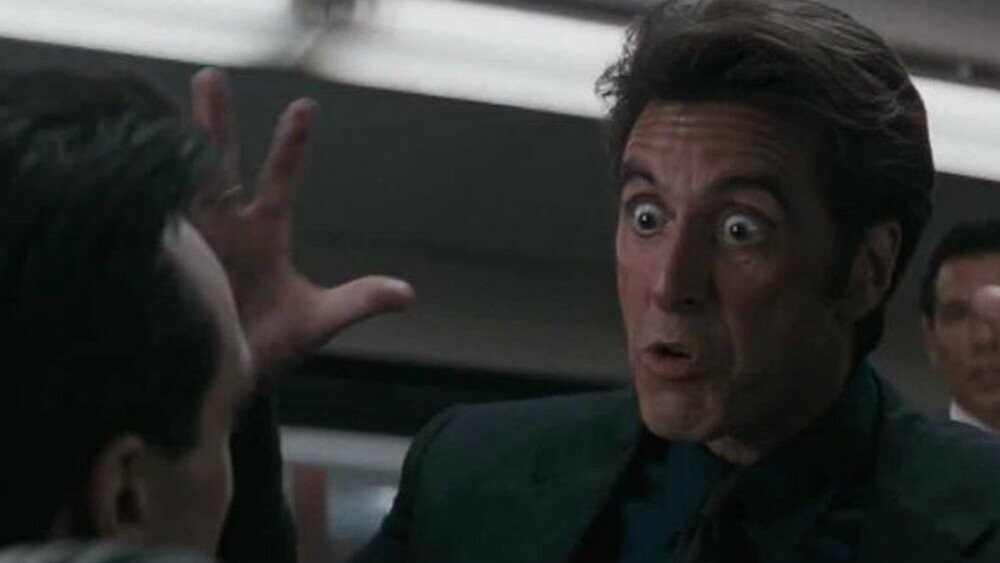 When Pacino pressures Hank Azaria’s character to become a police informant, Azaria wonders aloud why he let himself to get romantically involved with the wife of one of DeNiro’s henchmen – at which point Pacino bellows, with all the subtlety and restraint of a televangelist downing energy drinks, that it’s “Because she’s got a greaaat ass!!” while his eyes bug out of his head like an old-timey cartoon wolf who just got back from the optometrist.